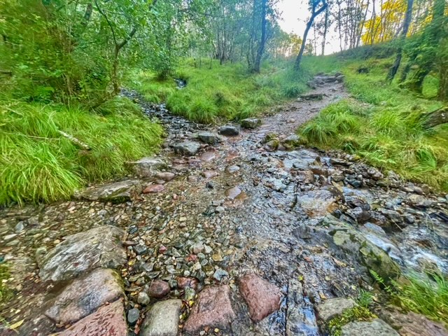 I could have managed the whole hike in the running shoes, which I’ve never run in once. Sadly, while backing up to take a photo, my left foot dropped into a stinky boghole and the sneaker came out a dark chocolatey brown. Aesthetics aside, the shoe stank. I apologize to everyone who had gear in the Kingshouse drying room. The corpse-like smell was my shoe. I discretely parked the sneakers behind the bunkhouse, said a tearful goodbye, and walked away without looking back.