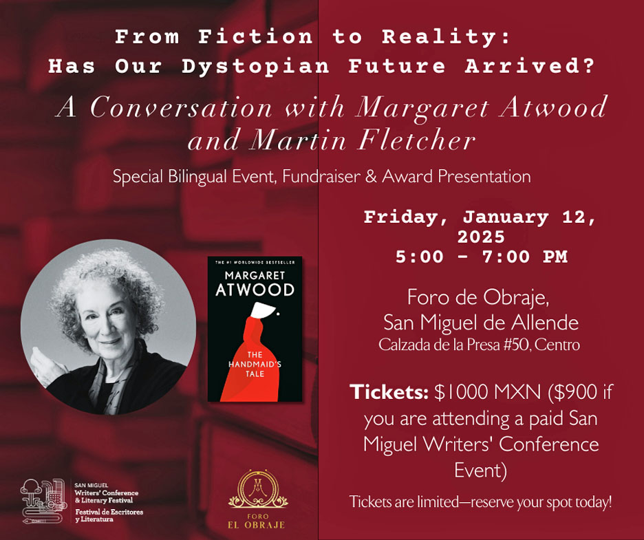 Margaret Atwood returns to San Miguel: Acclaimed author Margaret Atwood and journalist Martin Fletcher will bat around the timely topic “From Fiction to Reality: Has Our Dystopian Future Arrived?” on Sunday, Jan. 12, 5-7 p.m., at Foro El Obraje, Calzada de la Presa, #50, Centro.