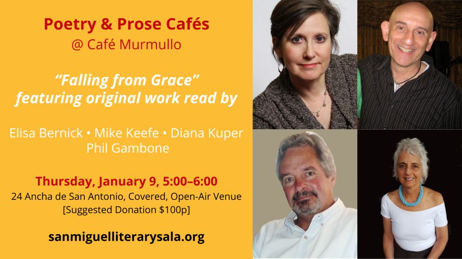 Poetry and Prose Cafe opens for the new year on Jan. 9 at Murmullo Cafe, Ancha San Antonio #24 at 5 p.m. The theme for the night will be “Falling from Grace.” Original works will be read by Elisa Bernick, Mike Keefe, Diana Kuper, and Phil Gambone. Details at www.sanmiguelliterarysala.org . A $100 peso donation is suggested.
