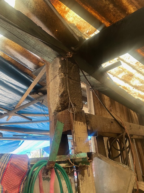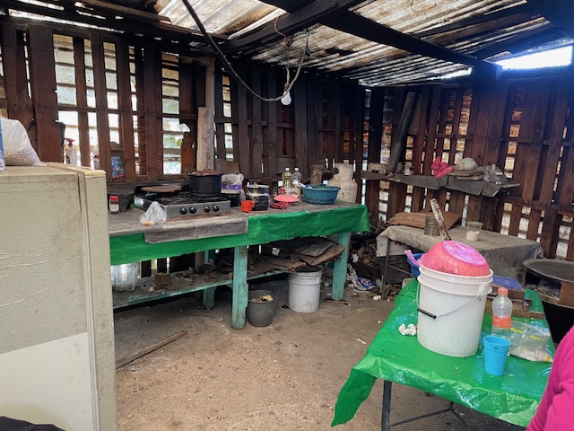 In the kitchen, a tabletop two-burner propane stove sits on a time-scarred high bench. A gas tank rests awkwardly in the corner. The walls are made from shipping pallets. The roof is a slapdash of corrugated sheets over a precarious, tied-together wood raft system. Light shines through the gaps. Curtain walls enclose the toilet, offering little privacy. There is no running water, no sinks, no sanitation. Those who are better off would call it a hovel. Still, it is their home.