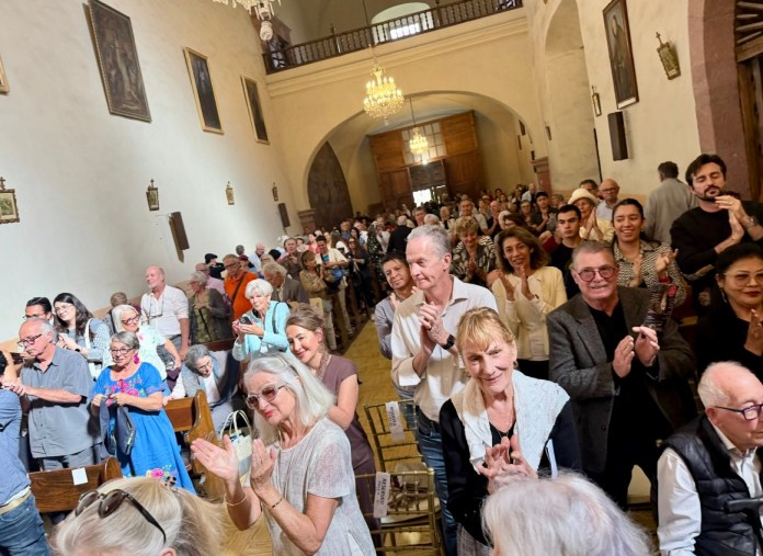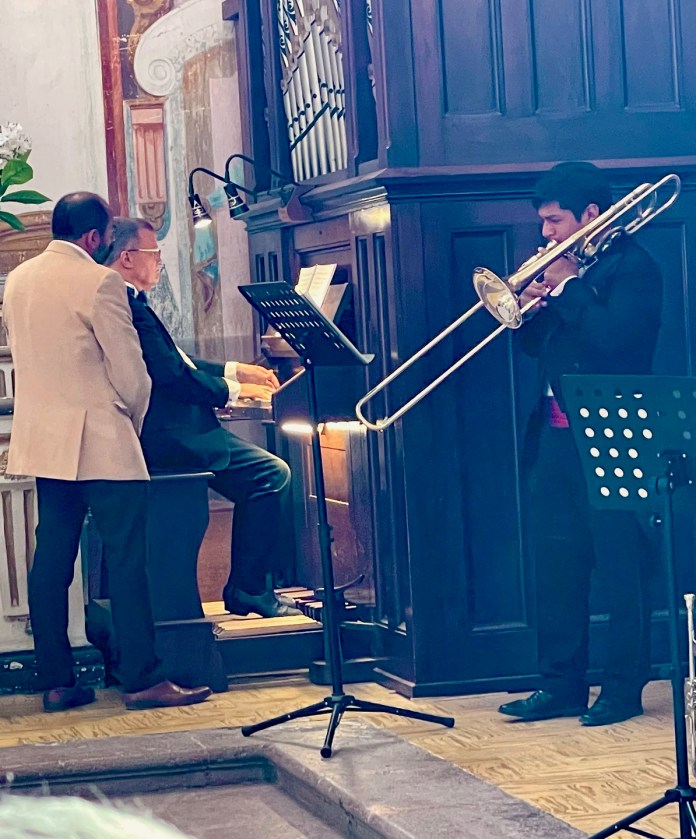 The concert was under the aegis of Chorale San Miguel and completely underwritten by arts patrons John and Joy Bitner. That’s right, some people give fruit cakes for Christmas, the Bitners throw open the doors to an ancient church and put on a concert of mostly classical music for free.