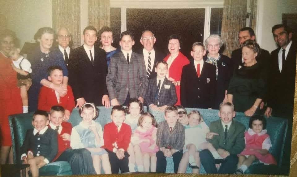 Our folks, Bob and Pat, are at left. At right, my dad’s siblings Don and Mary Lou. Clearly hadn’t met their forever partners yet, but soon. All three of the kids were married for life. They did that in those days. Don and Janet had five sons. Mary Lou and Bill had six daughters and two sons. Jim and I ended up with six more brothers and a sister.