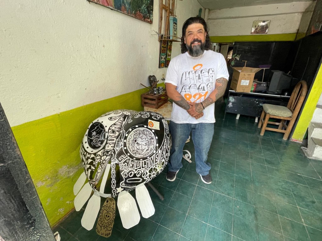 Romeo brought the bike from his Gorilla Garage near Tacos Don Felix in Colonia San Felipe to his new Rat Rod Art gallery in Colonia San Antonio, at 20 de Enero Norte#32. Did I mention that he is also an artist? Romeo creates sculptures, often incorporating discarded car parts into his tableaus. The gallery should open in a few weeks.