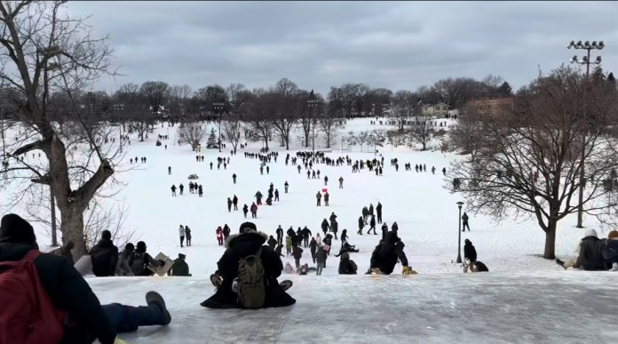 A video shows dozens of Minneapolis citizens sliding down an icy slope to join scores of other protestors on the far side of a wintry landscape.