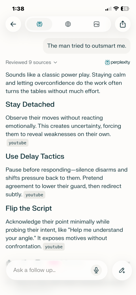 What Perplexity replied: “Sounds like a classic power play. Staying calm and letting overconfidence do the work often turns the tables without much effort.”